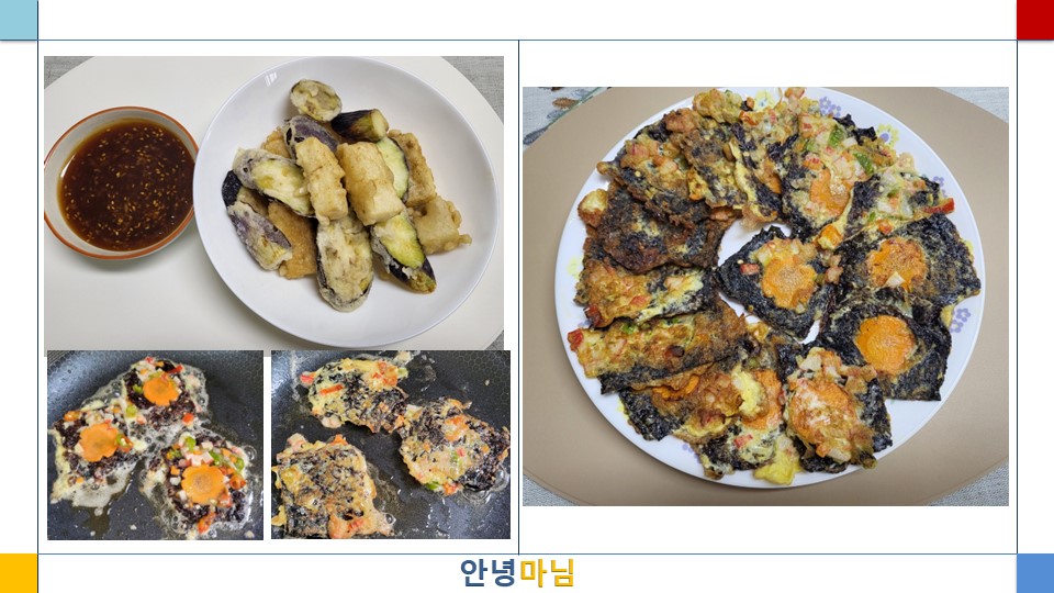 오늘은 갑상선 기능 저하증이 있는 분들이 섭취하면 좋은 곱창김을 전으로 구워 먹어 보았다. 원하시는 채소를 계란에 함께 다져 넣어서 전을 구우면 더욱 맛이 좋다. 오늘 곱창김전에는 당근을 많이 넣어 보았다. 그리고 갑상선 기능 항진증이 있는 분들에게 좋은 두부와 가지를 녹말가루에 튀겨 새콤달콤한 탕수 소스에 찍어 먹는 두부 가지 탕수를 해보았다. 속이 든든하게 채워지는 느낌이고 만드는 것도 번잡하지 않아서 잘 활용해 보시면 좋을 것 같다. 두부대신 전복과 가지를 튀겨서 전복 가지 탕수를 해 먹어도 좋다.