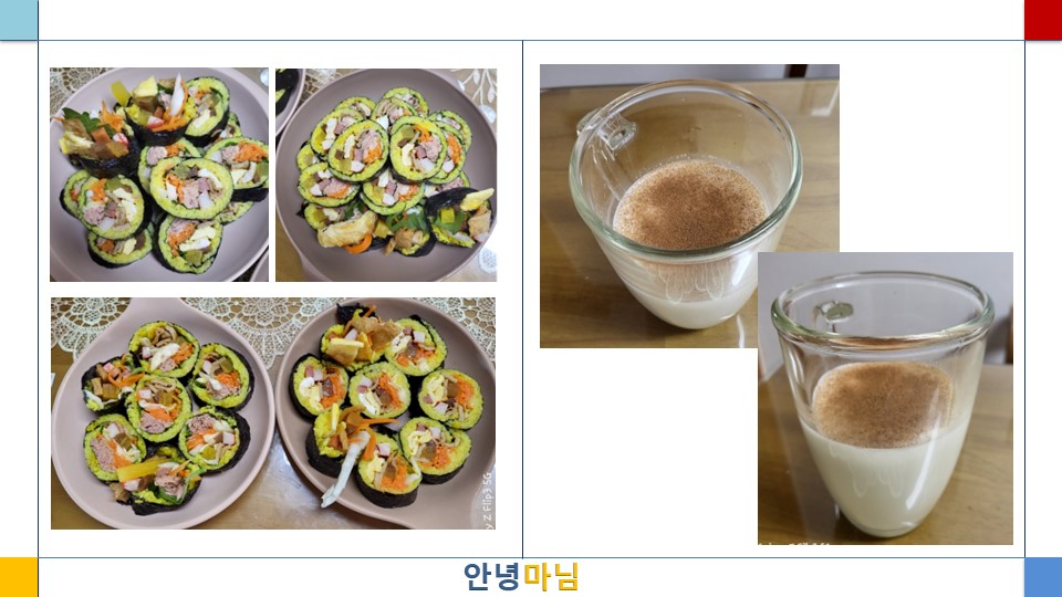 오늘은 강황쌀로 밥을 지어, 오메가 3 지방산이 풍부한 참치김밥을 만들어보았다. 따뜻하게 우유를 데워 생강청을 넣은 생강라테를 마시는 것도 도움이 될 것이다. 시나몬 스틱을 넣어 빨대처럼 마시면 좋다고 하지만, 시나몬 스틱이 없으면 그냥 시나몬 가루만 뿌려서 먹는 것도 괜찮다. 우리는 그저 건강에 도움이 되는 음식을 섭취하는 것이지 쉐프가 아니므로 모든 것이 완벽하게 갖춰져야만 음식을 할 수 있는 것은 아니다.