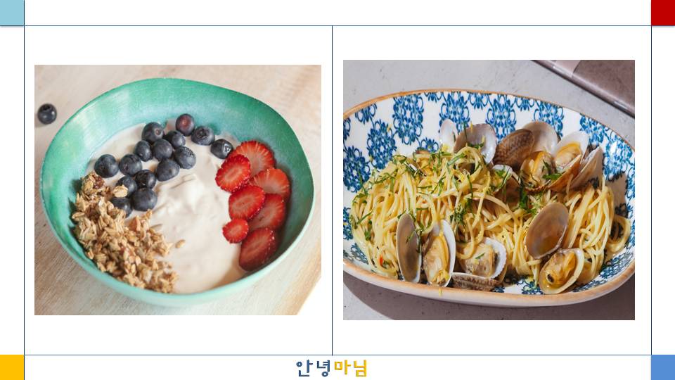 오늘은 구내염에 좋은 음식으로 그레놀라를 곁들인 그릭요거트와 봉골레파스타를 해보았다. 식이섬유와 통곡물이 풍부한 시리얼을 아몬드 브리즈에 곁들여 먹는 것도 좋고 상큼한 과일들과 시리얼을 그릭 요구르트와 함께 먹는 것도 구내염에 도움이 된다. 계란을 삶아 집안의 신선한 채소들과 연어를 넣어 샐러드를 먹는 것도 구내염을 위해서 좋은 선택일 것 같다. 바지락을 많이 넣어 봉골레 파스타를 해 먹는 것도 구내염을 예방하는 훌륭한 식사가 될 것이다.