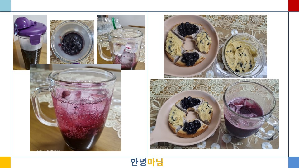 오늘은 아침식사로 건강한 통밀베이글에 병아리콩으로 만든 후무스에 블랙올리브와 올리브오일 약간을 첨가한 올리브후무스를 곁들였다. 그리고 냉동 블루베리로 만든 콩포트를 활용하여 베이글에도 발라 먹고, 무설탕 탄산수에 블루베리 콩포트를 넣어 블루베리 에이드로 아침음료를 대신하였다. 통밀베이글에 담백한 후무스와 상큼한 블루베리 콩포트를 곁들이니 많이 달지도 않고 신선한 맛이었다. 블루베리 에이드는 에이드에 설탕이 첨가되지 않아서 음료 자체는 예쁜 색깔의 탄산수를 마시는 느낌이었으나, 가라앉은 콩포트를 건져 먹으며 마시니 충분히 상큼하고 달콤했다.
