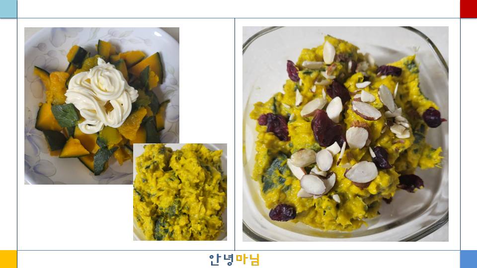 오늘은 간단히 단호박을 전자레인지로 통으로 5분 돌려서 물러진 상태에서 잘라 씨를 손질하고 다시 3분 정도 더 전자레인지로 익혀 간단히 버터 약간과 마요네즈를 섞어 견과류와 곁들여 단호박 샐러드를 만들어 보았다. 조리도 번거롭지 않고 만약 버터와 마요네즈를 첨가하지 않아도 올리브유 조금을 섞어 부드럽고 고소하게 먹을 수 있다. 이때 마요네즈를 섞지 않으려면 단호박을 너무 무르게 익히지 말고 익은 뒤 수분을 조금 제거하고 샐러드로 만드는 것을 추천한다.